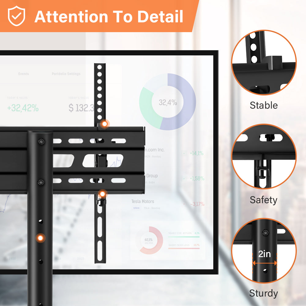 Universal Rolling TV Stand:This mobile TV stand fits most 32''-85'' flat or curved TVs, VESA compatibility between 100x100 mm to 600x400mm,it hold up to 110lbs.