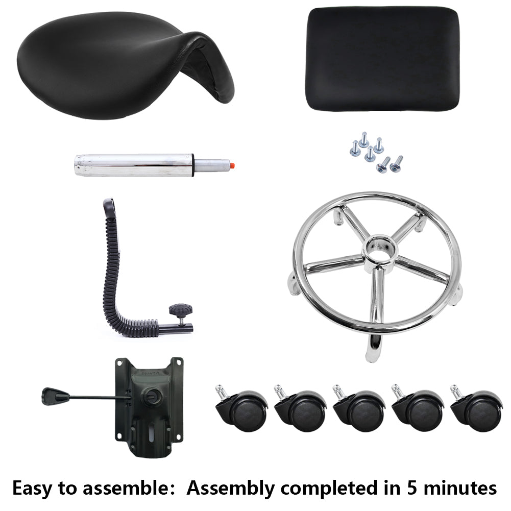 360 Saddle Seat:360 degree swivel, five-star roller,easy to roll on hard floor,safe for soft floor.Solid metal base, don't worry about tipping over. hold up 300 LB